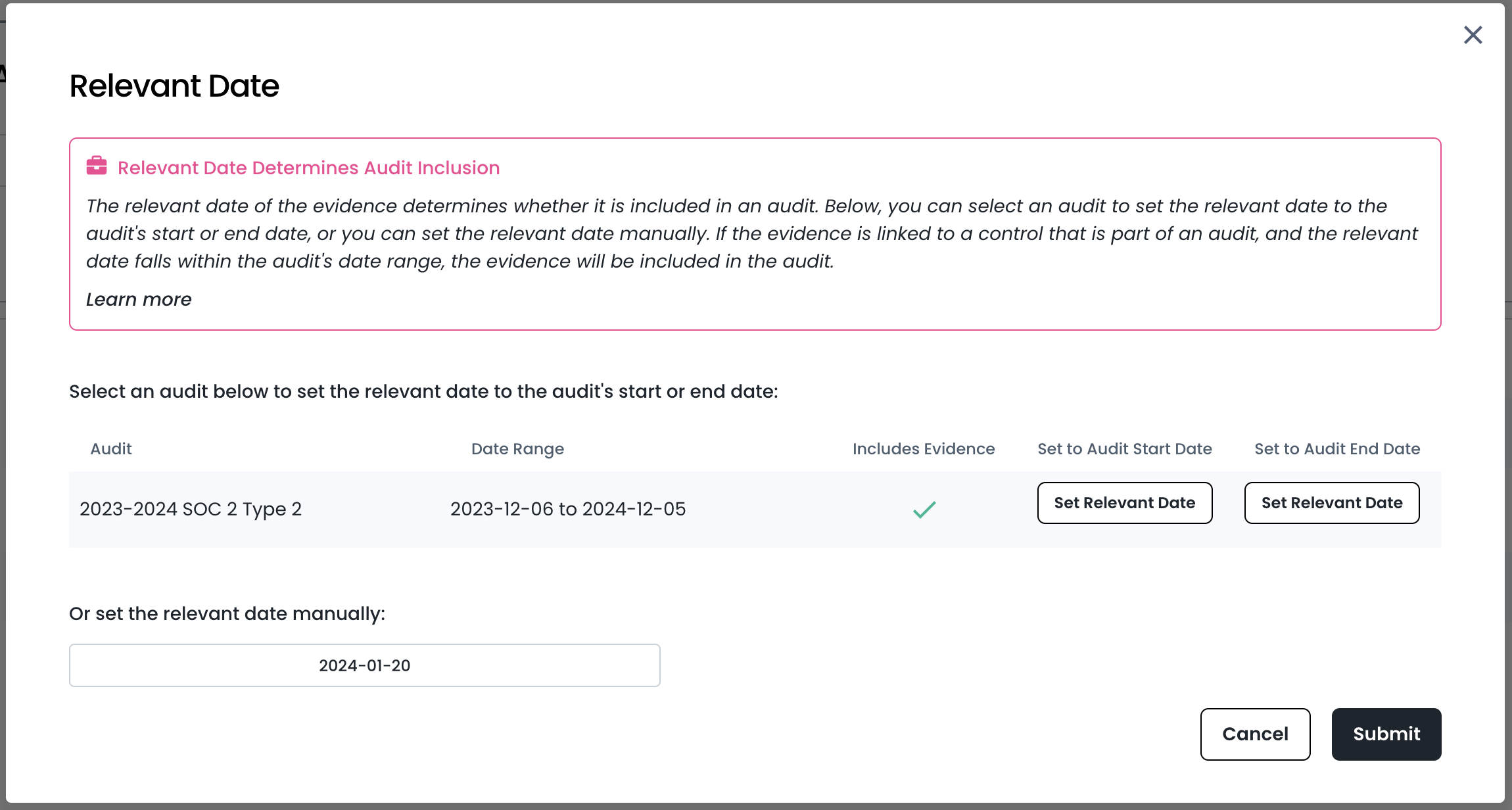- Easier, more intuitive way to change the evidence “relevant date” (determines which audits a piece of evidence will appear in).